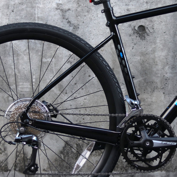 メインコンポにはシマノ クラリス(2×8speed)を採用。最小ギア比1.06とロードバイクとしては軽く、グラベルバイクとしては重い丁度間のギア比を採用。舗装路を犠牲にせず、登坂も楽しめる配慮されたギア比◎