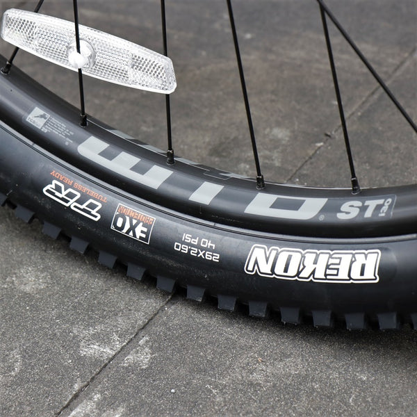 タイヤはトレイル向けの MAXXIS REKON(29×2.6) 、MTBとしてのポテンシャルが高まった印象。セミファットタイヤはトレイルでも走破性抜群です。