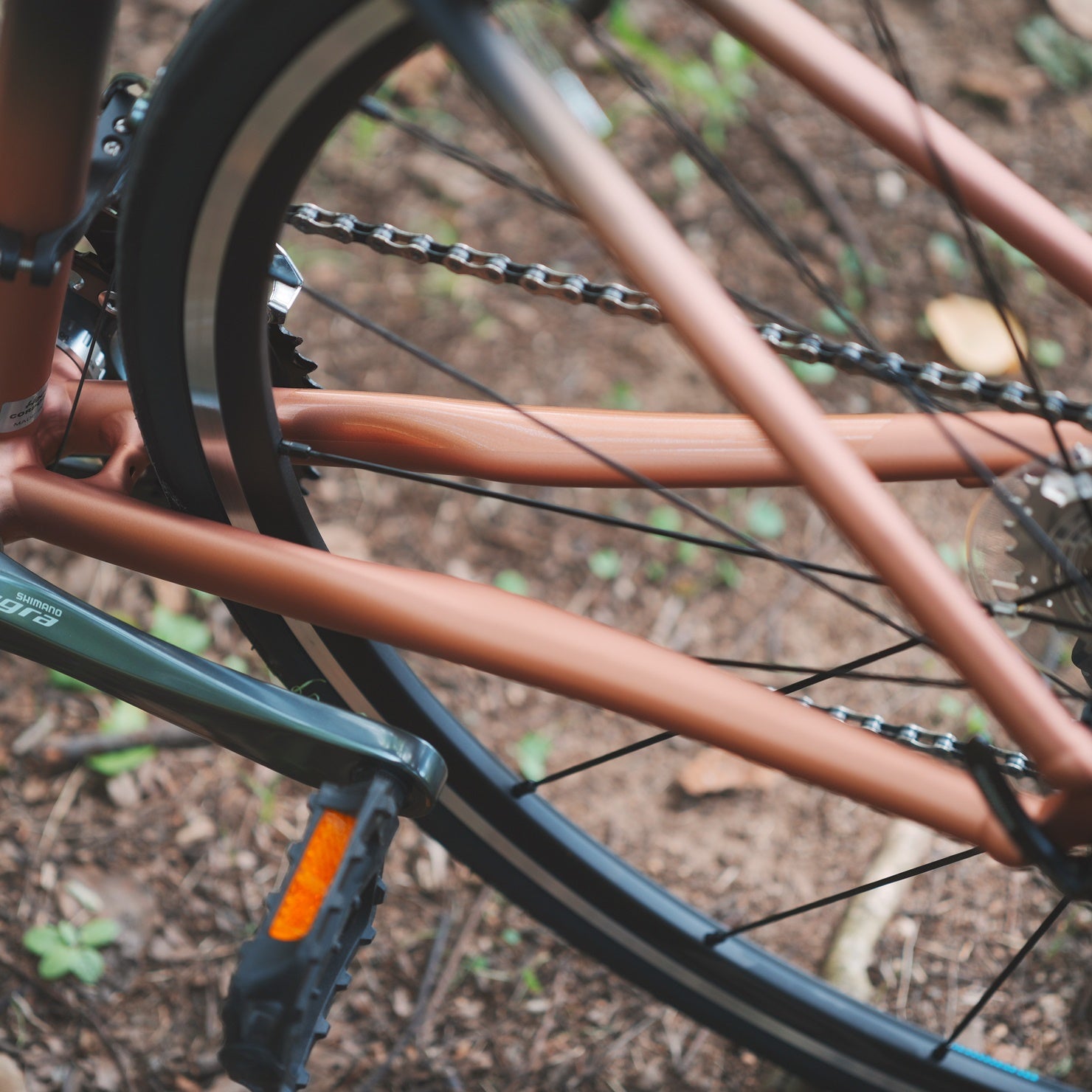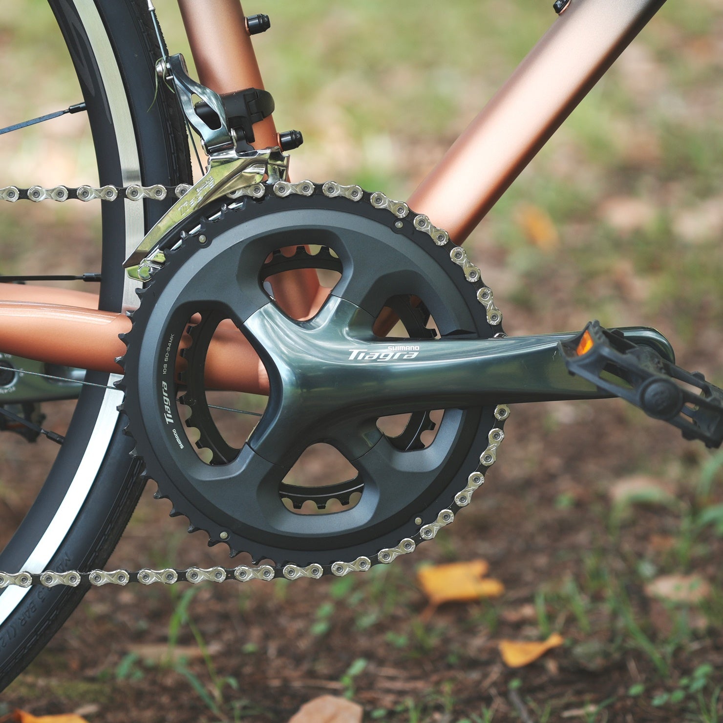 Shimano Tiagraメインの構成ながら、ブレーキはワンランク上の105キャリパーを採用しているのも好ポイントです。ロードバイク入門から次のステップアップを考えている方まで、自信を持っておすすめできるアルミロードです。