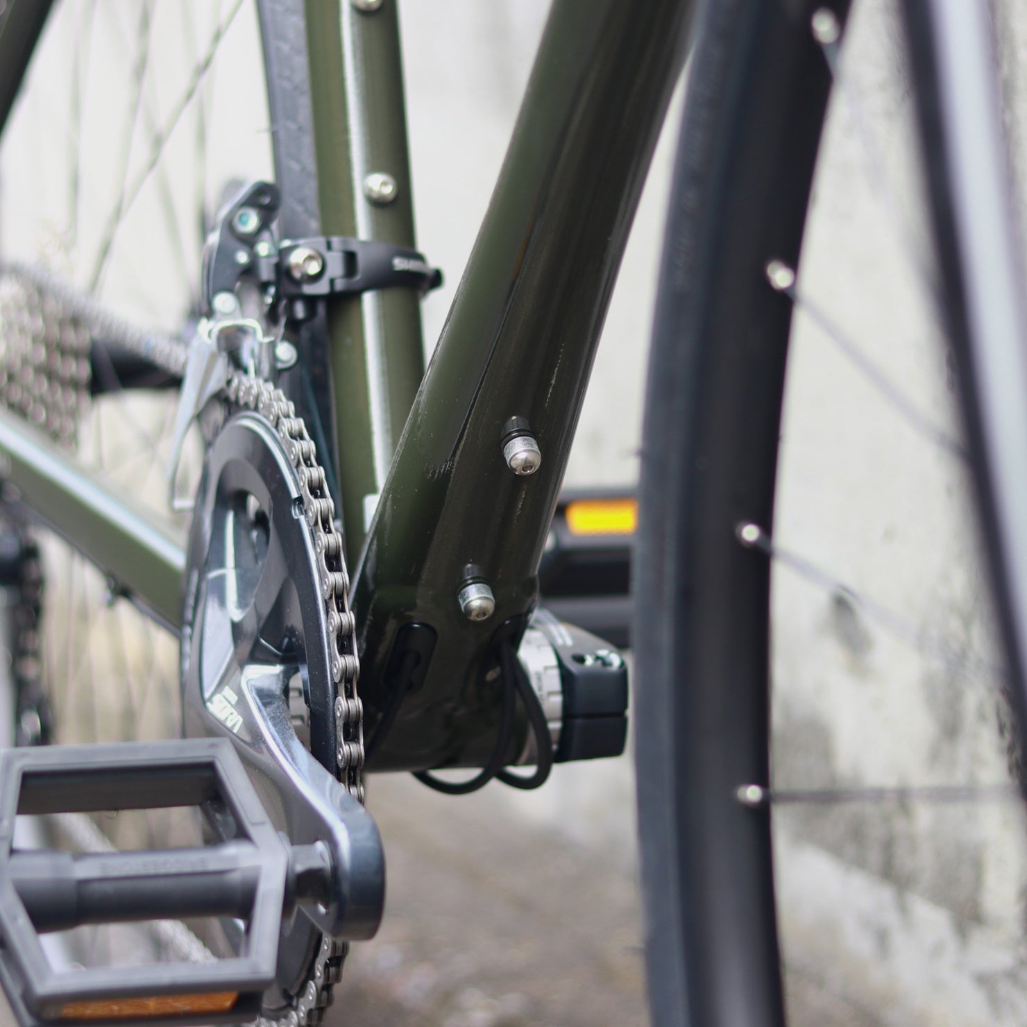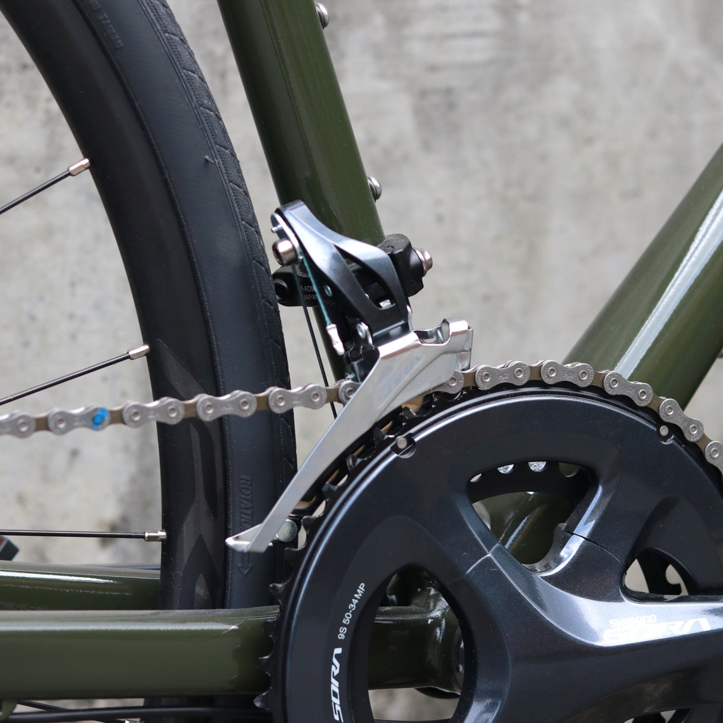メインコンポにはSHIMANO SORA(2×9速)を採用し、同価格帯では省かれがちなクランクやブレーキ、ホイールもすべてシマノ製で統一。フラットマウントブレーキ&スルーアクスルなど、拡張性にも優れる近代スペックで、初めての1台としても、長く付き合える内容となっています。
