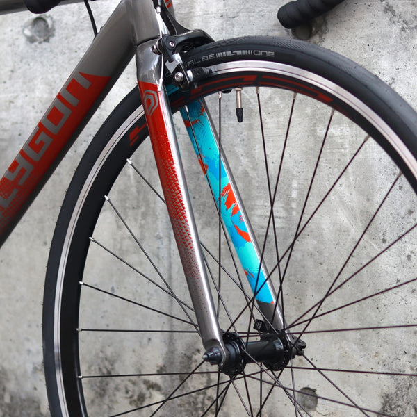 フロントフォークには、耐久性と軽量性に配慮されたアルミコラムのカーボンフォークを採用。
