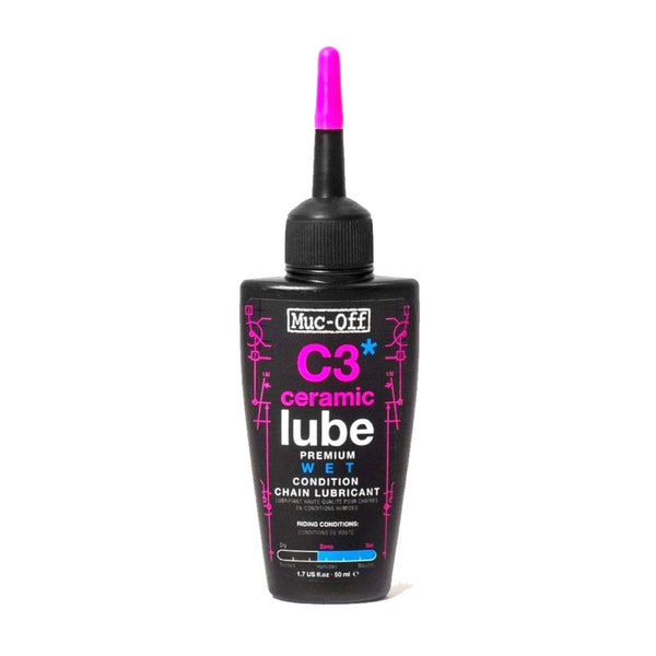 Muc-off C3 WET CERAMIC LUBEは、雨天や泥の中でも高い潤滑性能を保つセラミック配合の高耐久ウェットルブ。