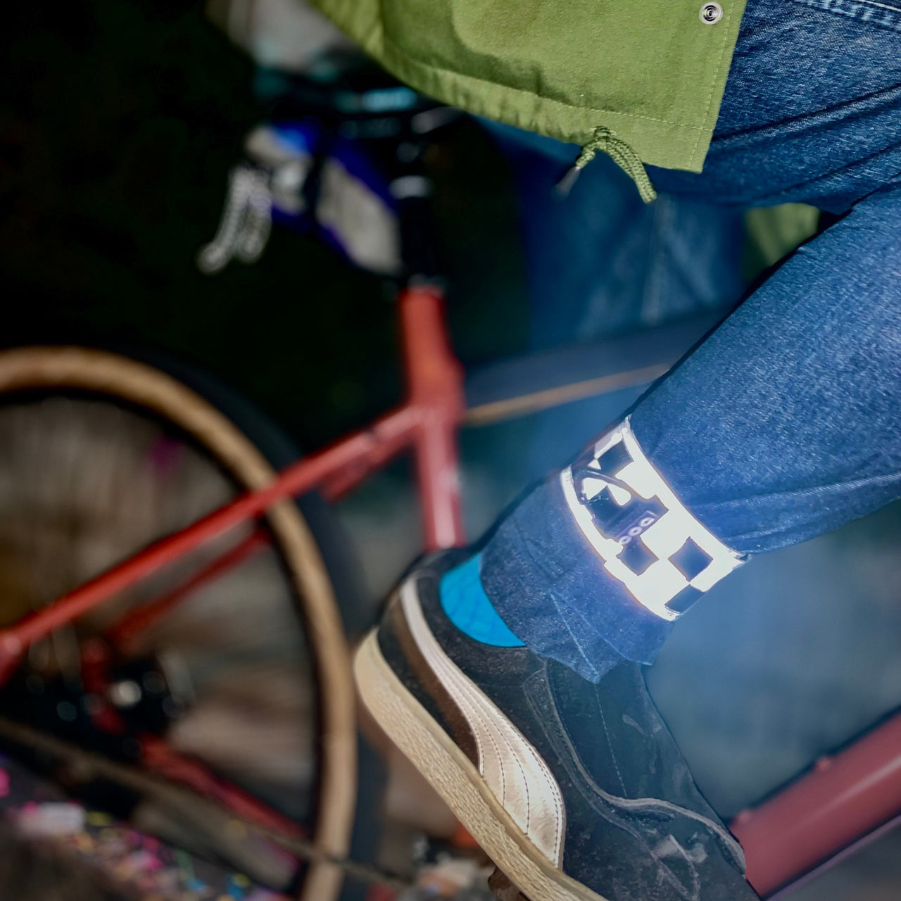 強力なリフレクターで夜間の視認性を確保しつつ、滑り止め付きでズレにくい設計