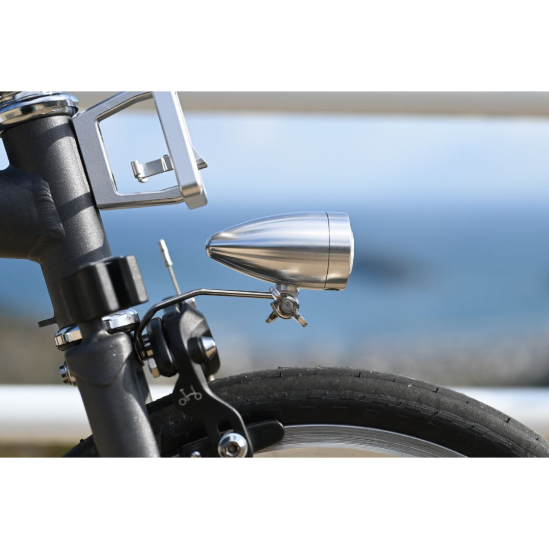 馬蹄形のディテールには旅の安全への願いも込められており、見た目と機能を両立する一灯。クラシックスタイルはもちろん、モダンなクロモリや街乗りバイクにも映えるデザインです。