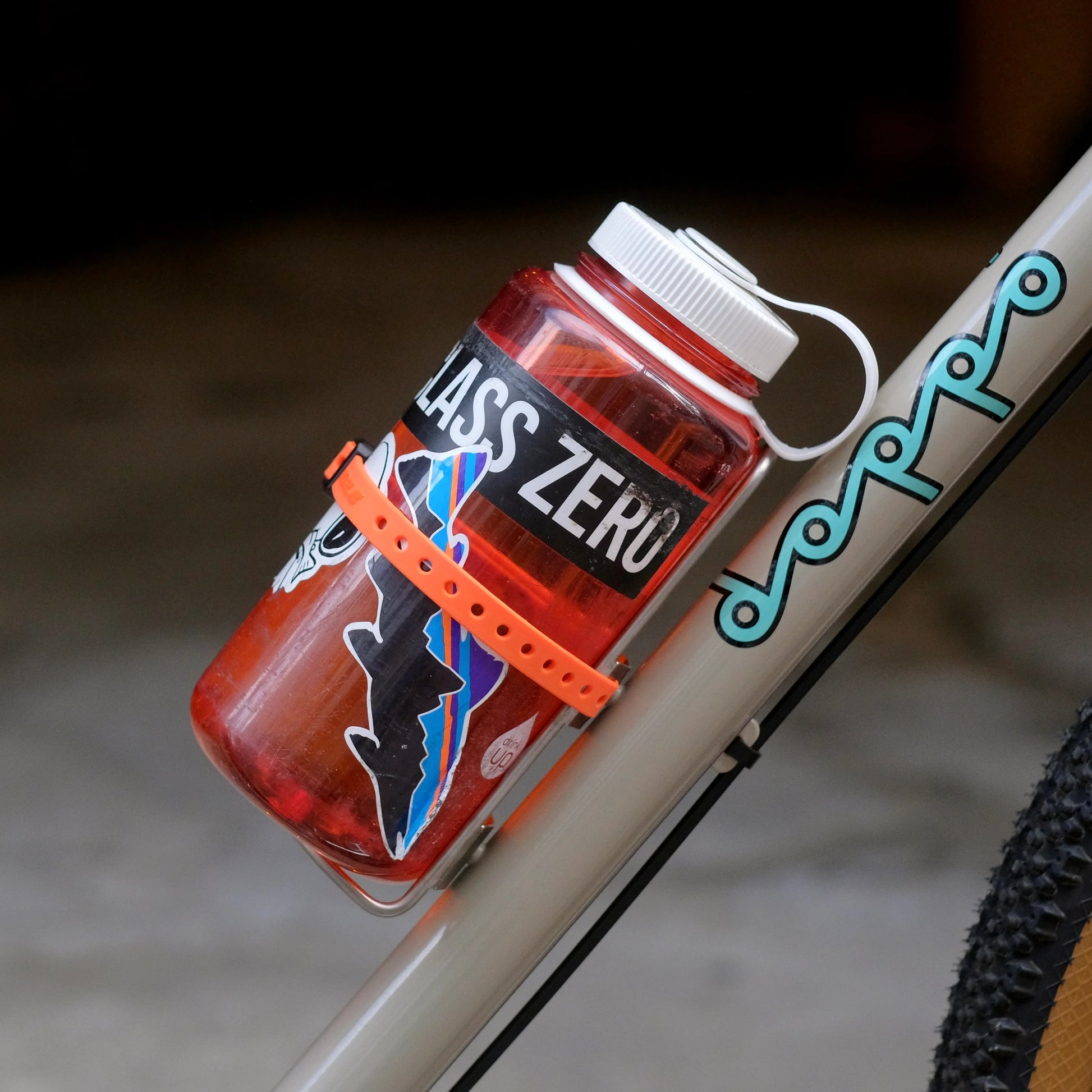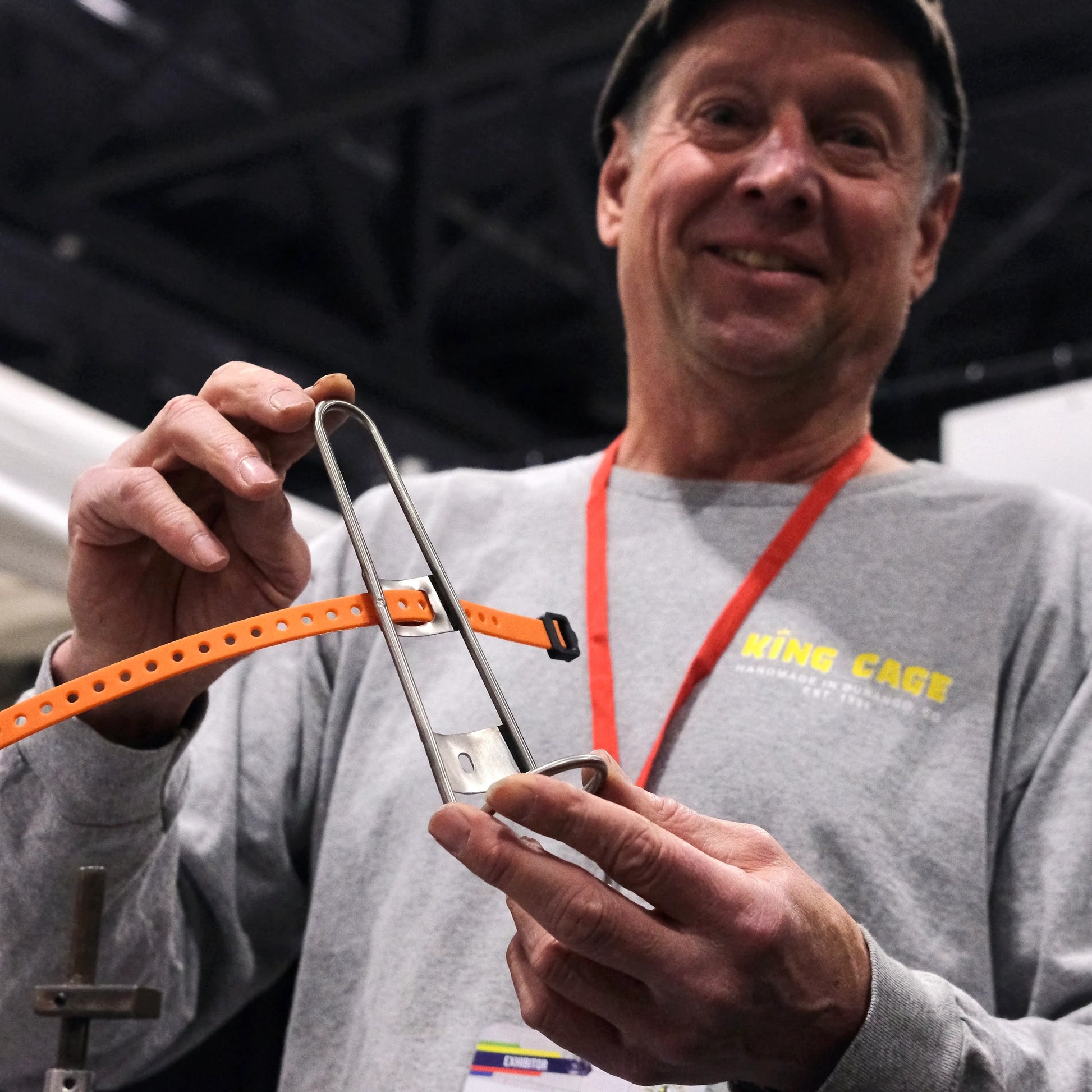 KING CAGE Mini Thing Cage。チタン製の軽量ケージで、ボトルやギアをしっかり固定。12/16インチストラップ付属のハンドメイドモデル。