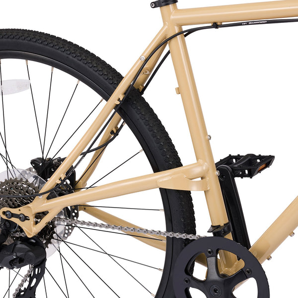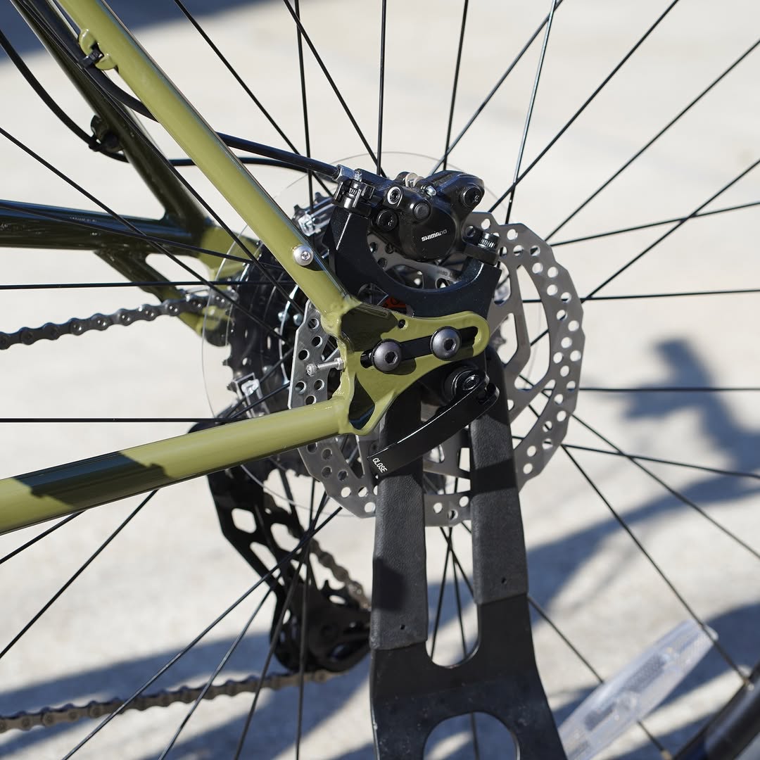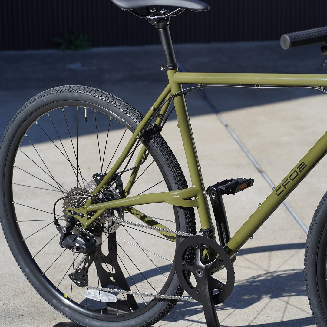 自転車の骨格であるフレームはCF01と同様に最大の特徴となるエレベーテッドチェーンステーと呼ばれるドライブ側のチェーンをまたぐ構造と、リアホイールの位置を前後に調整できるスライドエンドの組み合わせにより、ロード・MTB・ベルトドライブ・シングルスピード等、パーツの変更で後から様々なコンポーネントにカスタマイズすることも可能です。 ※カスタマイズはメカニックへご相談ください。