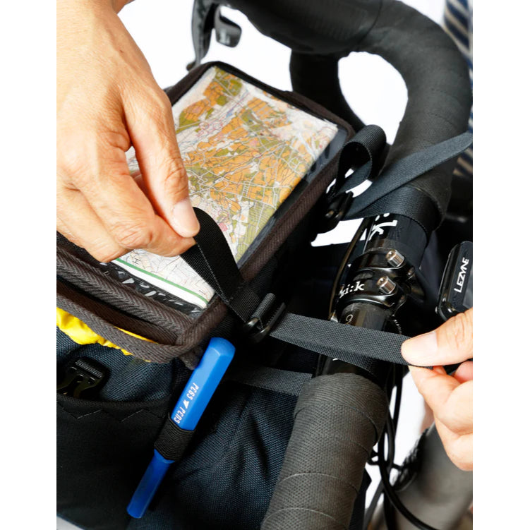 RMW × PAPERSKYの2WAYフロントバッグ。着脱式クリアケース&2Lポーチ付き、ラック不要のソフトマウント。輪行や自転車旅に最適な6L設計。