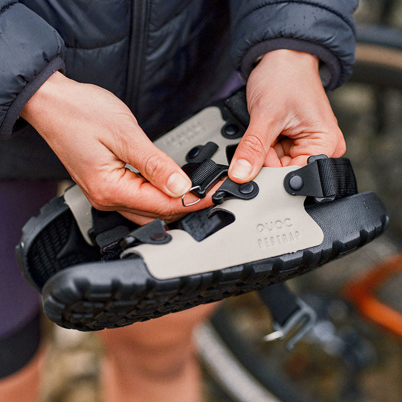 QUOCとRestrapという、イギリスを拠点とする2つのブランドが手を組み、サイクリング後の快適性とバイクパッキングでの実用性を融合させた特別なサンダルが誕生しました。QUOCのシューズ作りにおける長年の革新と、Restrapのバイクパッキングノウハウが融合したこのサンダルは、旅と冒険を愛するサイクリストのための究極の“ポストライド”アイテムです。