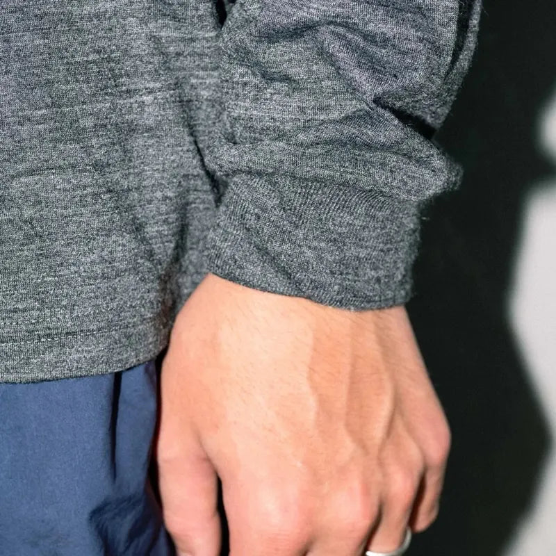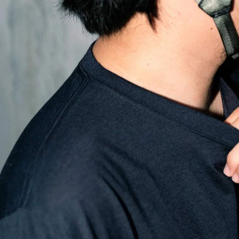 メリノTが普段のロンTのノリで着られたら最高だよな〜ってことで、一枚、または普段着とのレイヤリングでも調子良さげな、ちょっと短めな丈のボックスシルエット。シャツやニット、冬場ならダウンジャケットの下に着ても良さそう。